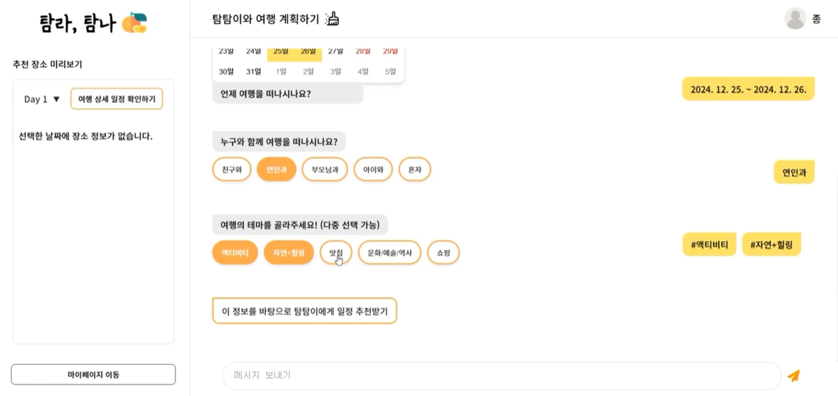 - ๋ํํ ์ธํฐํ์ด์ค๋ฅผ ํตํด ์ถ์ฒ๋ ์ผ์ ์ ๋ํ ์์ ์์ฒญ ๊ฐ๋ฅ