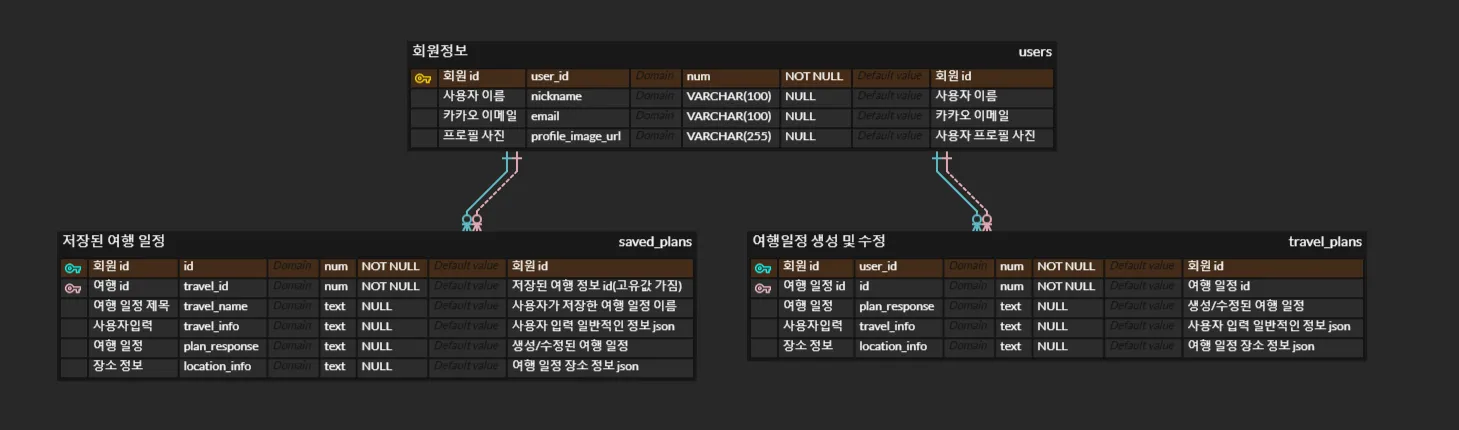 ์ด๋ธ(Users, saved_plans, travel_plans) ๊ฐ์ ๊ด๊ณ๋ฅผ ์ค๊ณ
