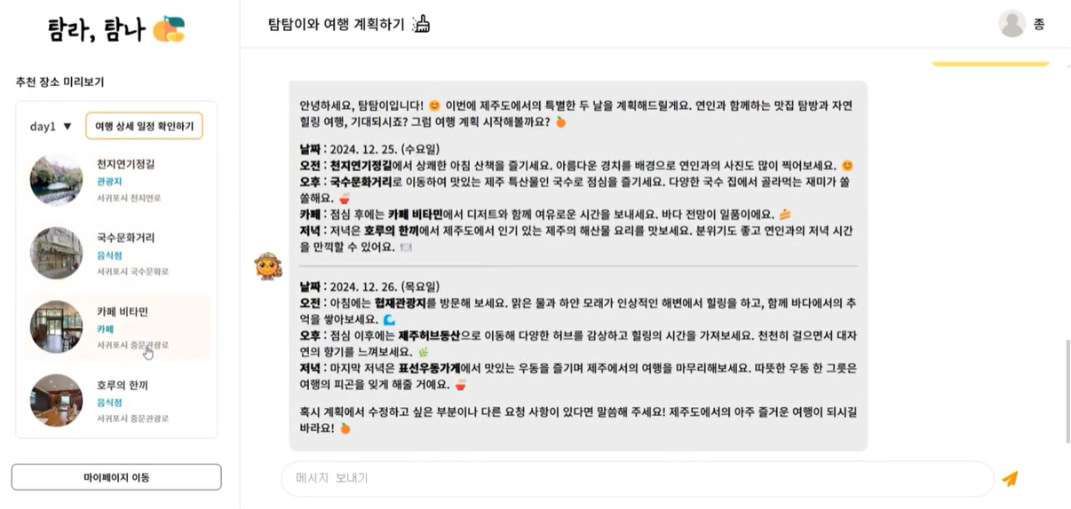 LLM๊ณผ RAG๋ฅผ ๊ฒฐํฉํ์ฌ ์ ์ฃผ๋๋ฅผ ์ฌํํ๋ ์ฌ์ฉ์๋ค์๊ฒ ๊ฐ์ธ์ ์ทจํฅ๊ณผ ํ์์ ๋ง์ถ ์ฌํ ๊ณํ์ ์ฝ๊ฒ ์ธ์ฐ๊ณ ์คํํ ์ ์๋๋ก ๋๋ ํ๋ซํผ
