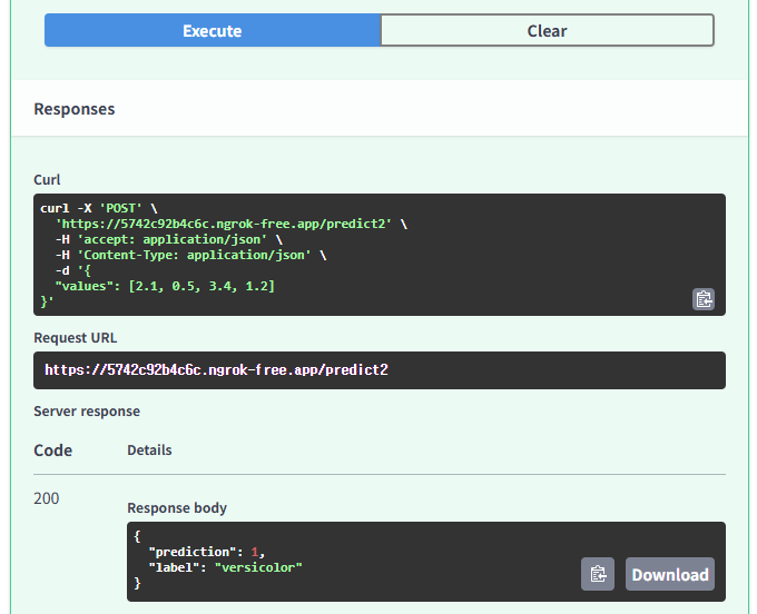 ✔️ /predict2 경로에서 값을 바꿔 리스트 형태로 body를 전송 -> versicolor로 예측!