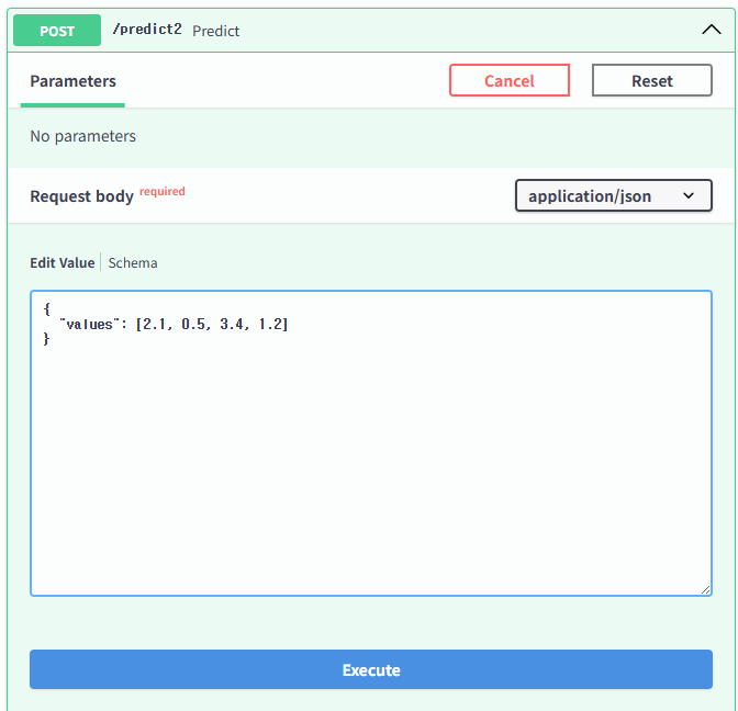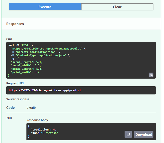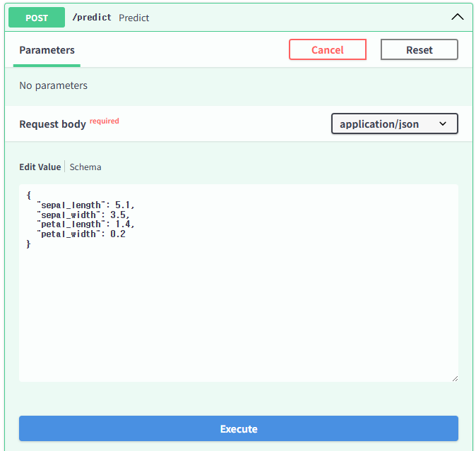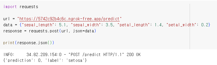 ✔️ /predict 경로에서 JSON 형태로 body를 전송 -> setosa라고 예측!